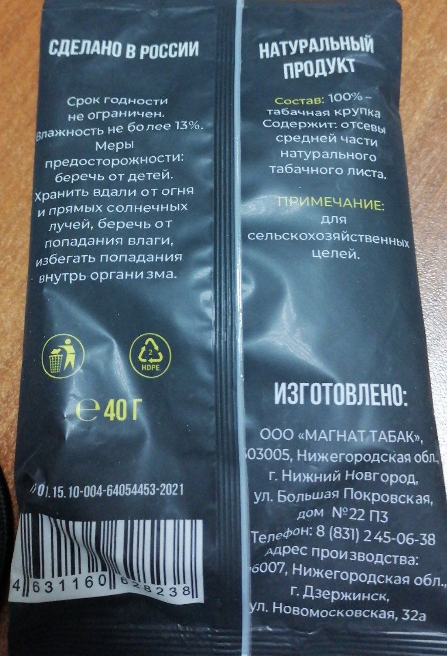 Махорка Крупка №2 40г из российского сырья, фасованная в Нижнем Новгороде в пакеты по 40г